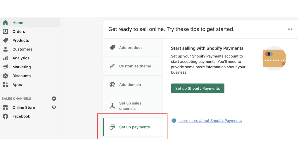 Enable payment gateways like Shopify Payments, PayPal, or Stripe to accept payments from customers.