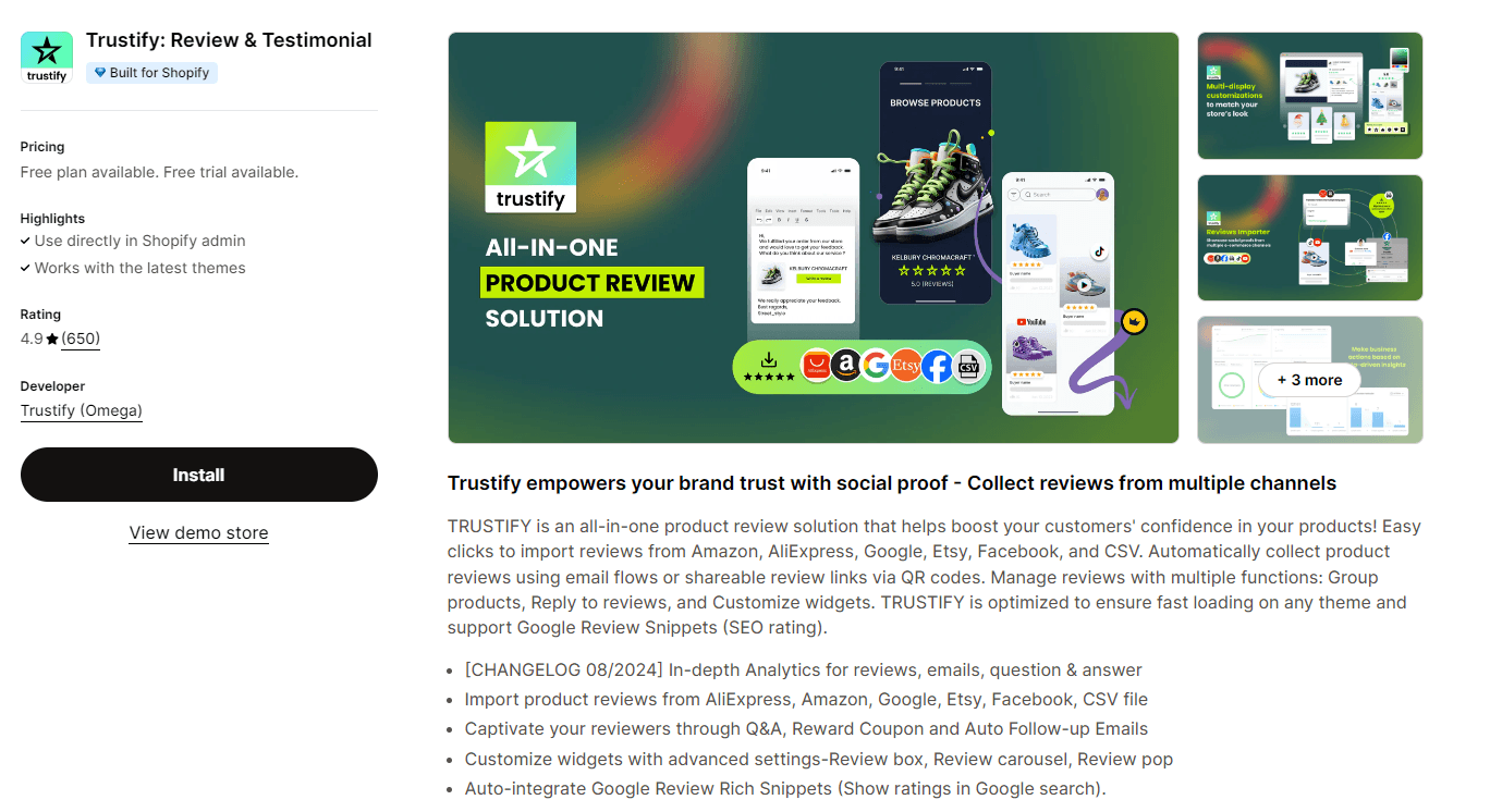 Display customer reviews and testimonials to build trust with potential buyers. Positive feedback helps convince others that your product is worth buying. You can also feature user-generated content, like photos or videos from customers using your products, to strengthen credibility. Try Trustify Review App to import reviews from Amazon, AliExpress, Google, Etsy, Facebook,..and customize widgets with advanced settings-Review box, Review carousel, Review pop.