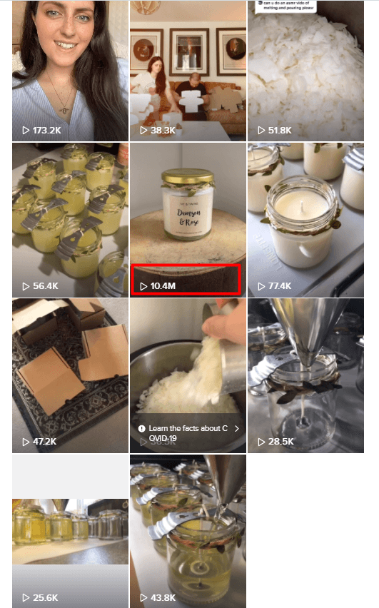 The newly-wed couple’s business started out of the wife’s hobby with handmade candles and soap. She made them for their wedding and went on to tell the business story that way. The view count was decent. Fluctuating around 100k at first until it soared to 10M views in a video when she just casually, authentically talks about how the candles are made.