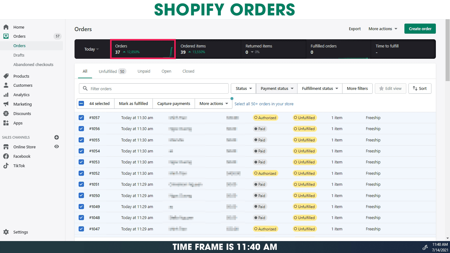Meanwhile, Shopify order shows 37 orders ( total 44 orders including 7 authorized orders)