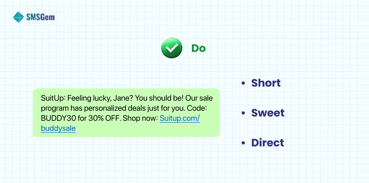 SHORT: SMS texts have a character limit of 160, so important to keep your messages short and to the point. Avoid using jargon or complicated language, and focus on delivering a clear message that is easy to understand.