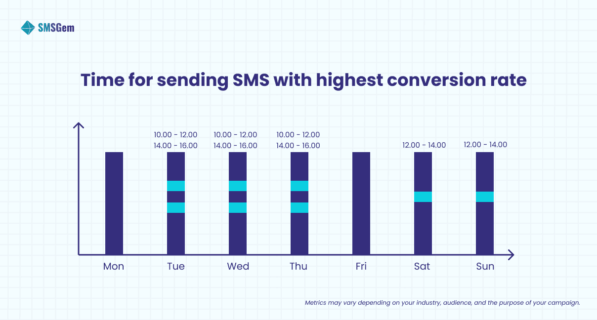 - Test and track: It’s important to test different send times and track engagement metrics such as open rates and click-through rates to determine the best time to send SMS messages for your specific audience and purpose.