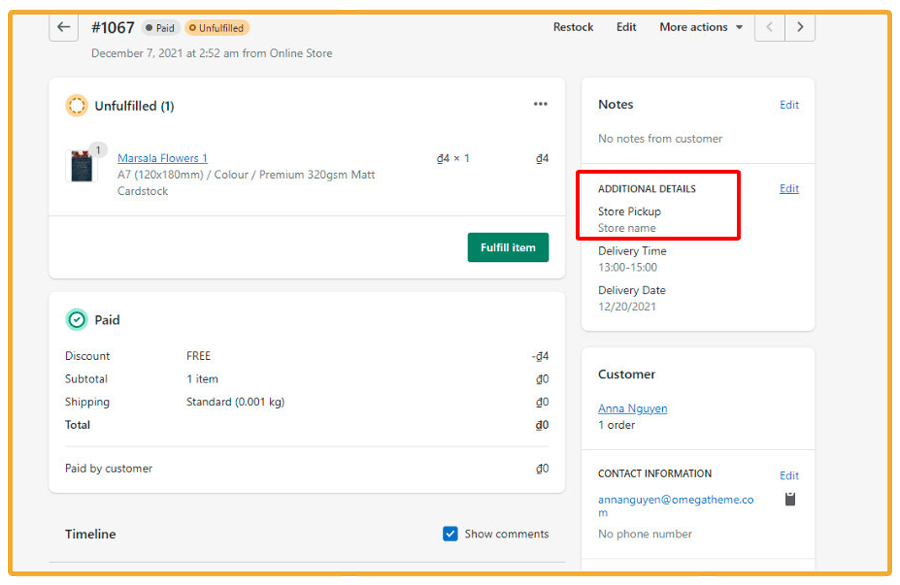 In your back office, from the Store pickup layout, you will be able to configure the conditions of this feature. Orders picked up in-store can be identified in your order history, thanks to the Additional details.