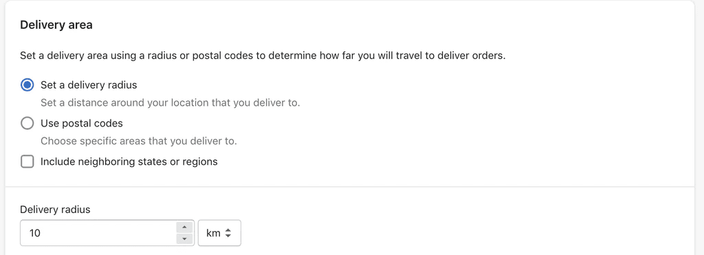 Go to your Shopify admin panel, click on “Settings”, then “Shipping and delivery”, and then enable “Local delivery”. From the Delivery area, choose the delivery radius method to set a distance around the location that you deliver to
