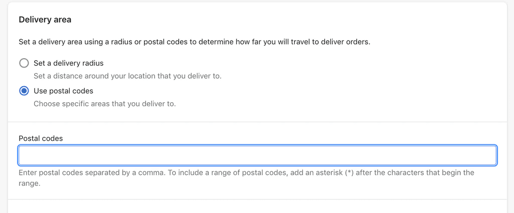 - Use postal codes: Enter a list of postal codes (up to a maximum of 3,000 characters) that you want to deliver to, separated by a comma and a space. To include a group of postal codes, add either an asterisk or a space after the initial characters to indicate a range of postal codes.