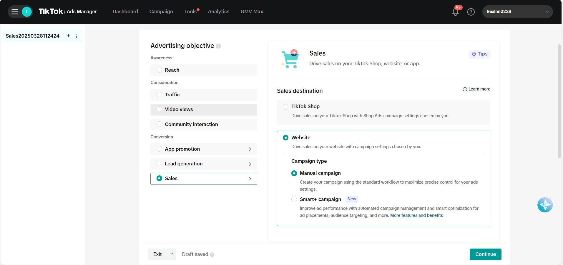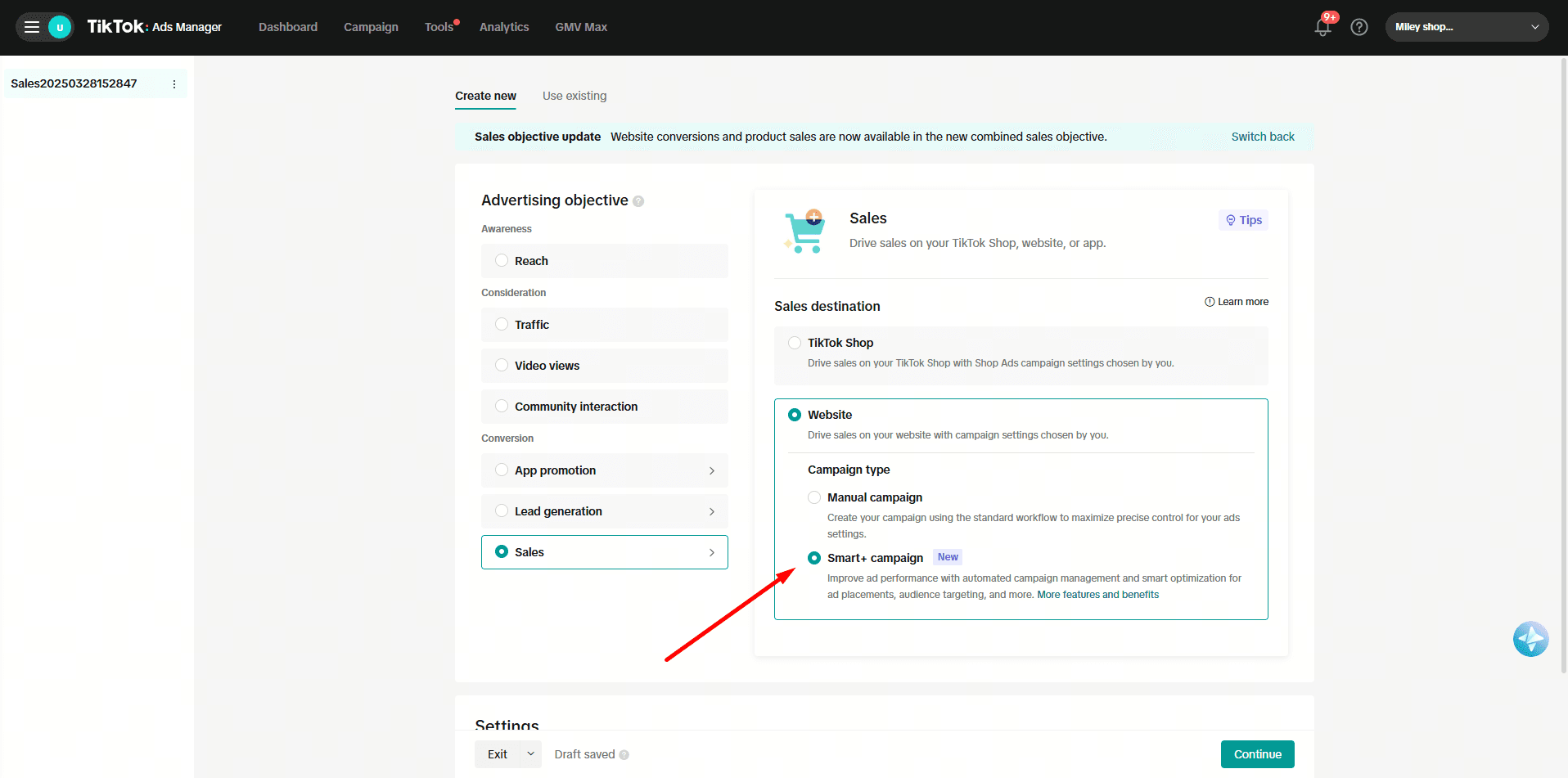 Choose your marketing objective. For conversion-focused campaigns, select “Sales” > “Website” to drive actions on your online store.