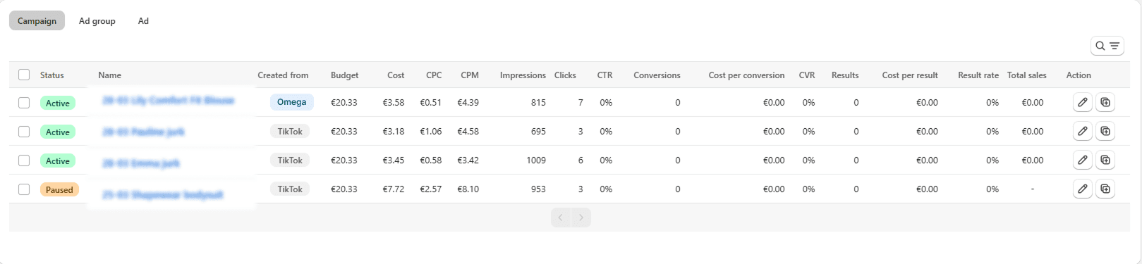 After launching your campaign, Omega directly pulls real-time performance data from TikTok into your dashboard for easy tracking. However, note that some data may experience a short delay due to TikTok’s conversion attribution window.