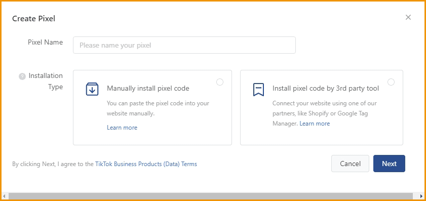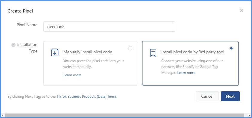 - TikTok partners gave you the option to create pixel code from a third party including Shopify and Google Tag Manager.