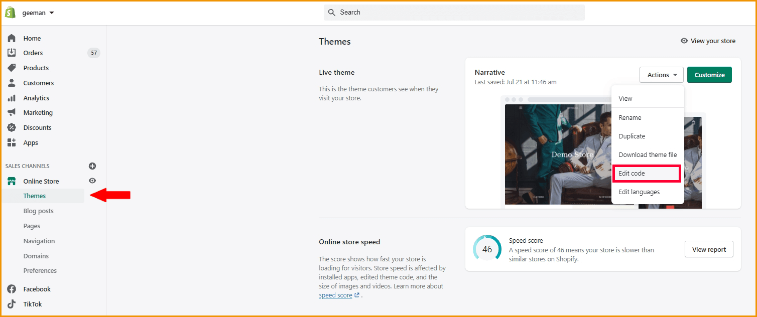 - Go to your Shopify store admin, under Online Store section, choose Themes -> Actions -> Edit Code