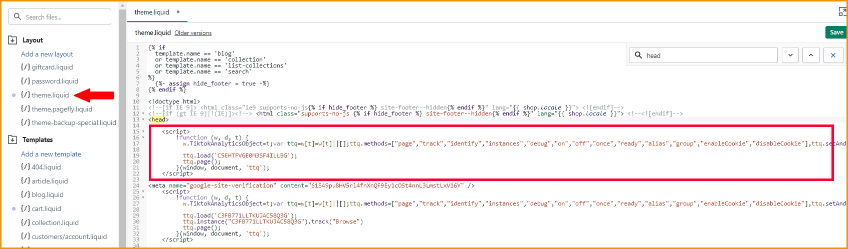 - In the theme.liquid file, paste the code you have copied between tags <head> and </head>. Please make sure you don’t paste the code within other scripts, every script has an opening and closing tag, for example <script> and </script>, { and }, you need to paste your code outside that area. Or simply, press Ctrl+F and search for the tag </head>, then paste the code right at the line before the tag </head>, which can help you to avoid any mistakes.