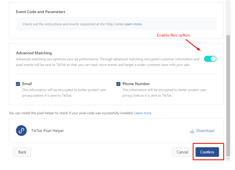 - Just scroll down, enable Advanced matching then click Confirm