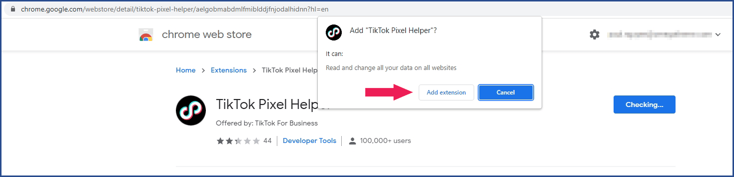 - Choose to Add to Chrome then go to your Shopify store and test on each page by clicking the TikTok Pixel Helper icon.