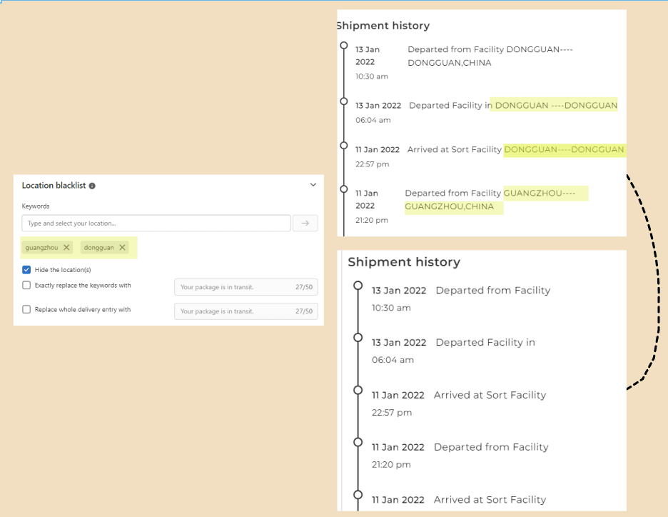 It also replaces any words you don’t want to show on the tracking page with your custom message.