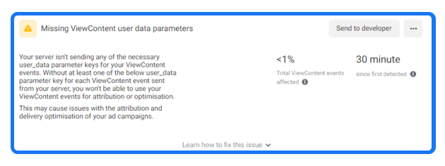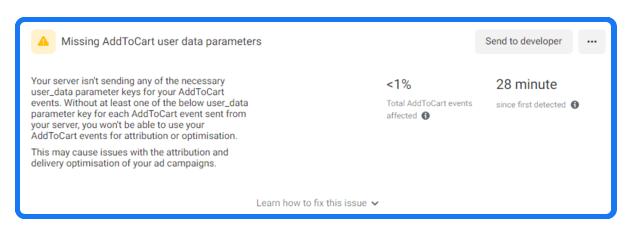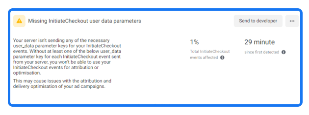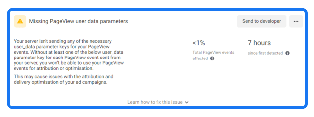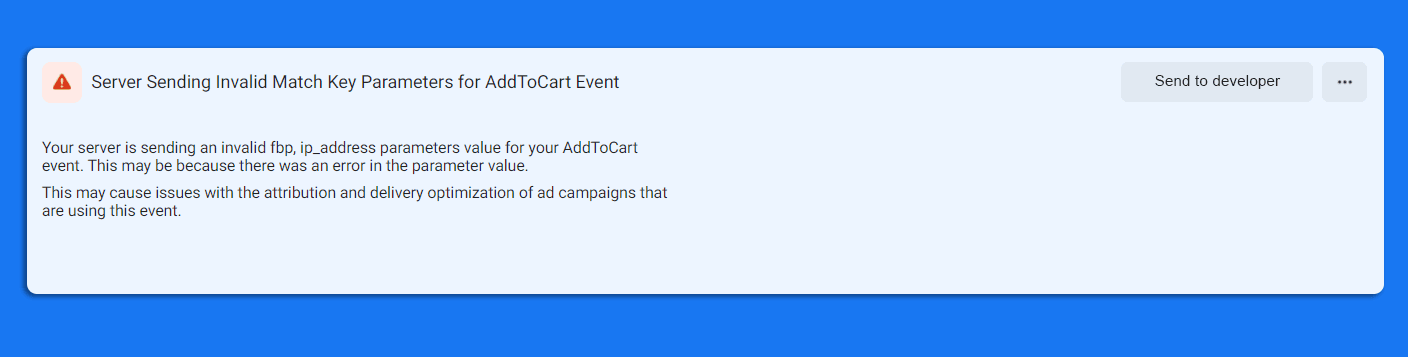 Your server is sending an invalid fbp, ip_address, and user_agent parameters value for your event. This may be because there was an error in the parameter value you set up. This may cause issues with the attribution and delivery optimization of ad campaigns that are using those events.