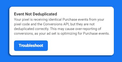 This can be indeed related to the cache issue of buyers’ browsers. Test your events and make sure each browser/server event has a unique Event ID. Then you must restrict the pixel to your verified domain only, not from other traffic sources. Once you do these, you can ignore the warning.