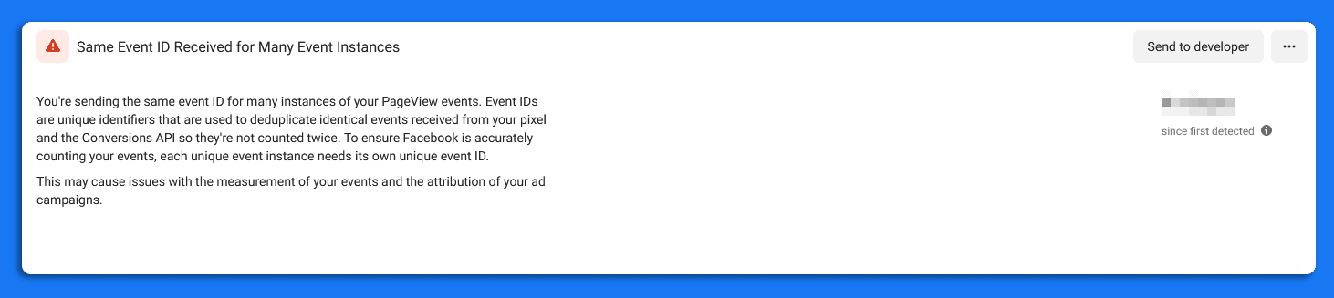 This error may cause issues with the measurement of your events and the attribution of your ad campaigns. When the buyers click your ads link and make two purchases simultaneously, Facebook will automatically create identical ID events. Or even two buyers click the add to cart a product or checkout at the same moment.