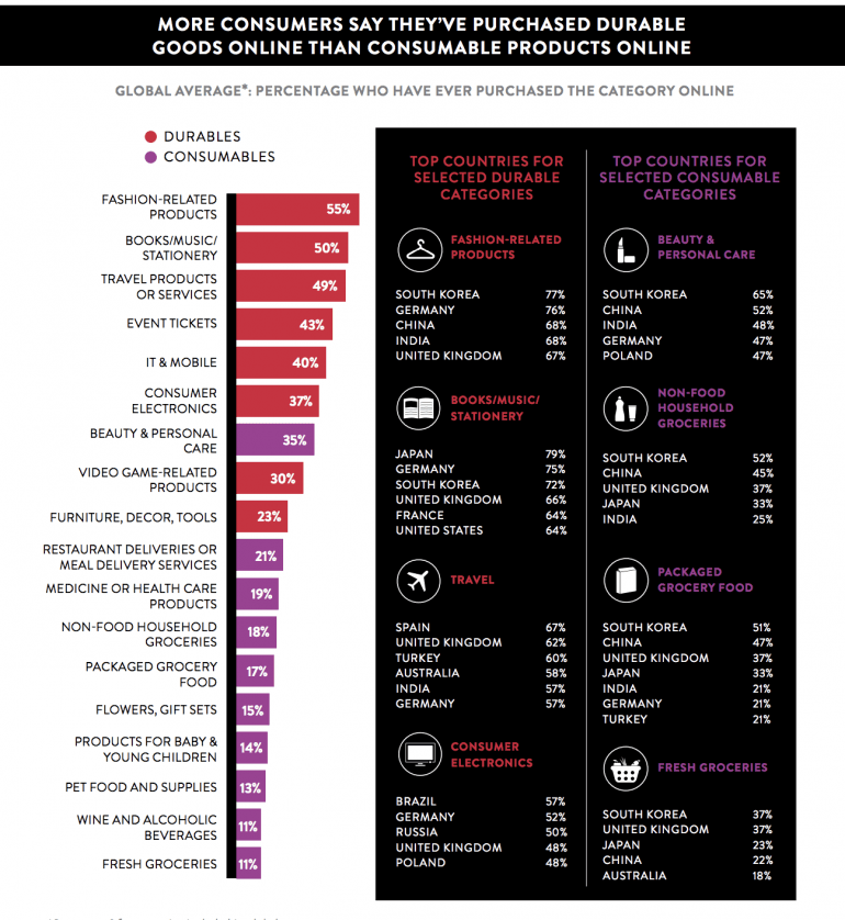 People buy a wide range of products from merchants outside their home country. While clothing remains the most popular type of goods, people also buy leisure products such as books, games as well. Electronics and IT supply comes third while beauty products takes the 4th place.