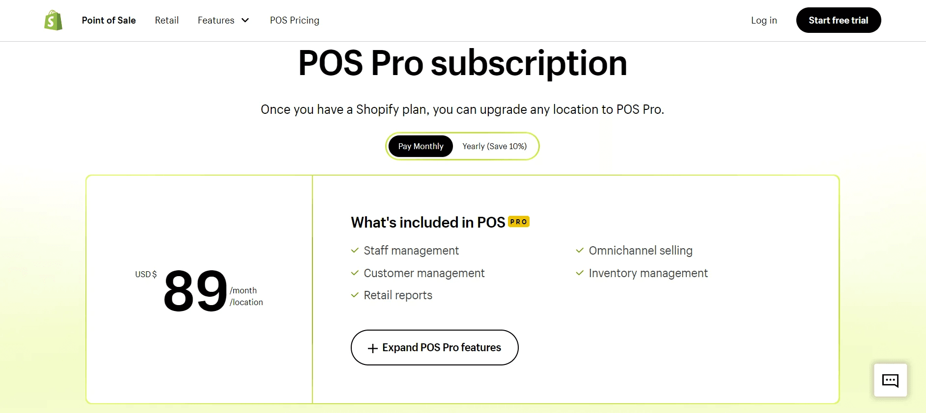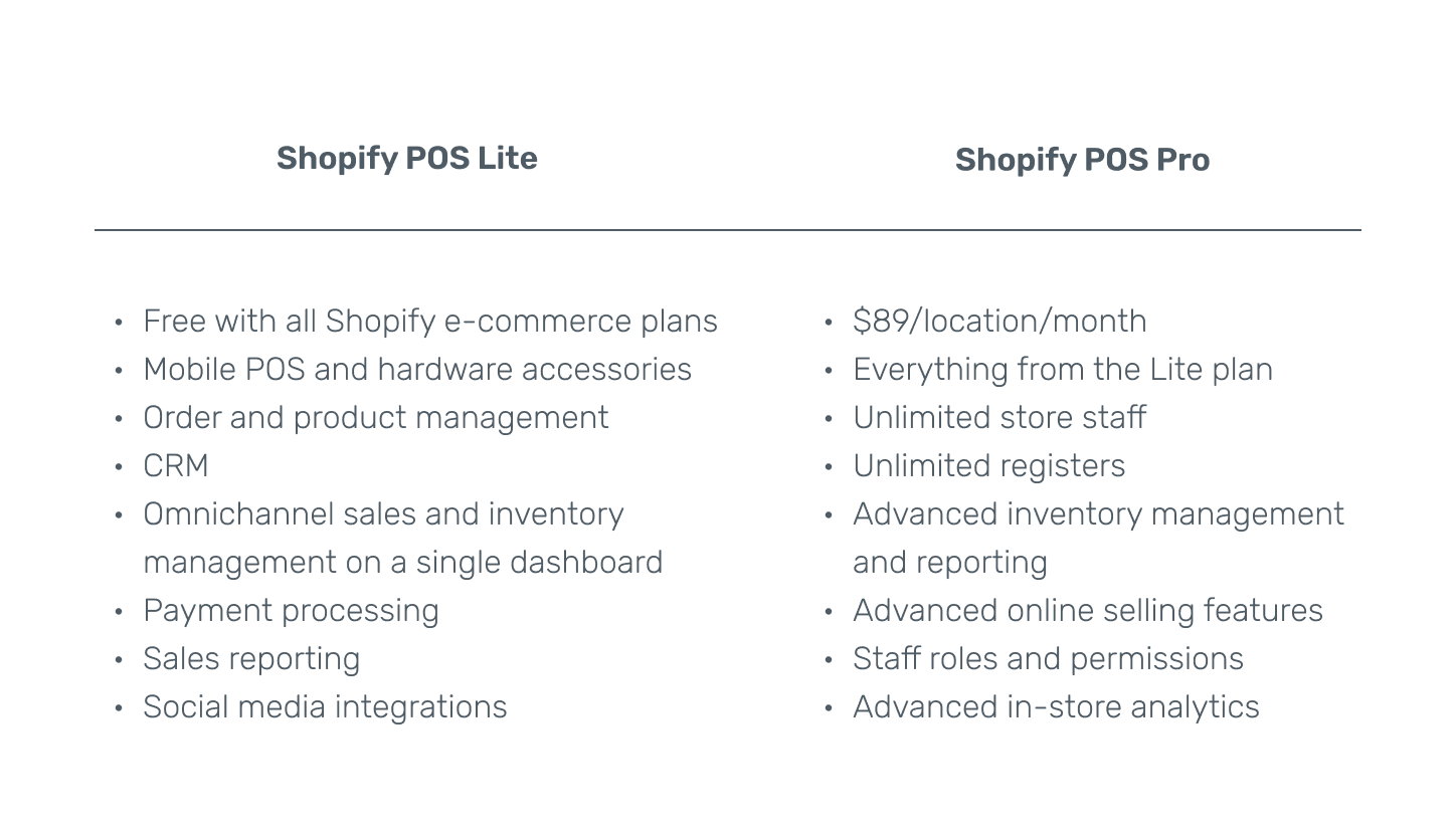 Shopify POS is typically included free with every plan, while POS Pro charges $89 a month for every location and offers features for deep inventory management, reporting, and omnichannel tools.