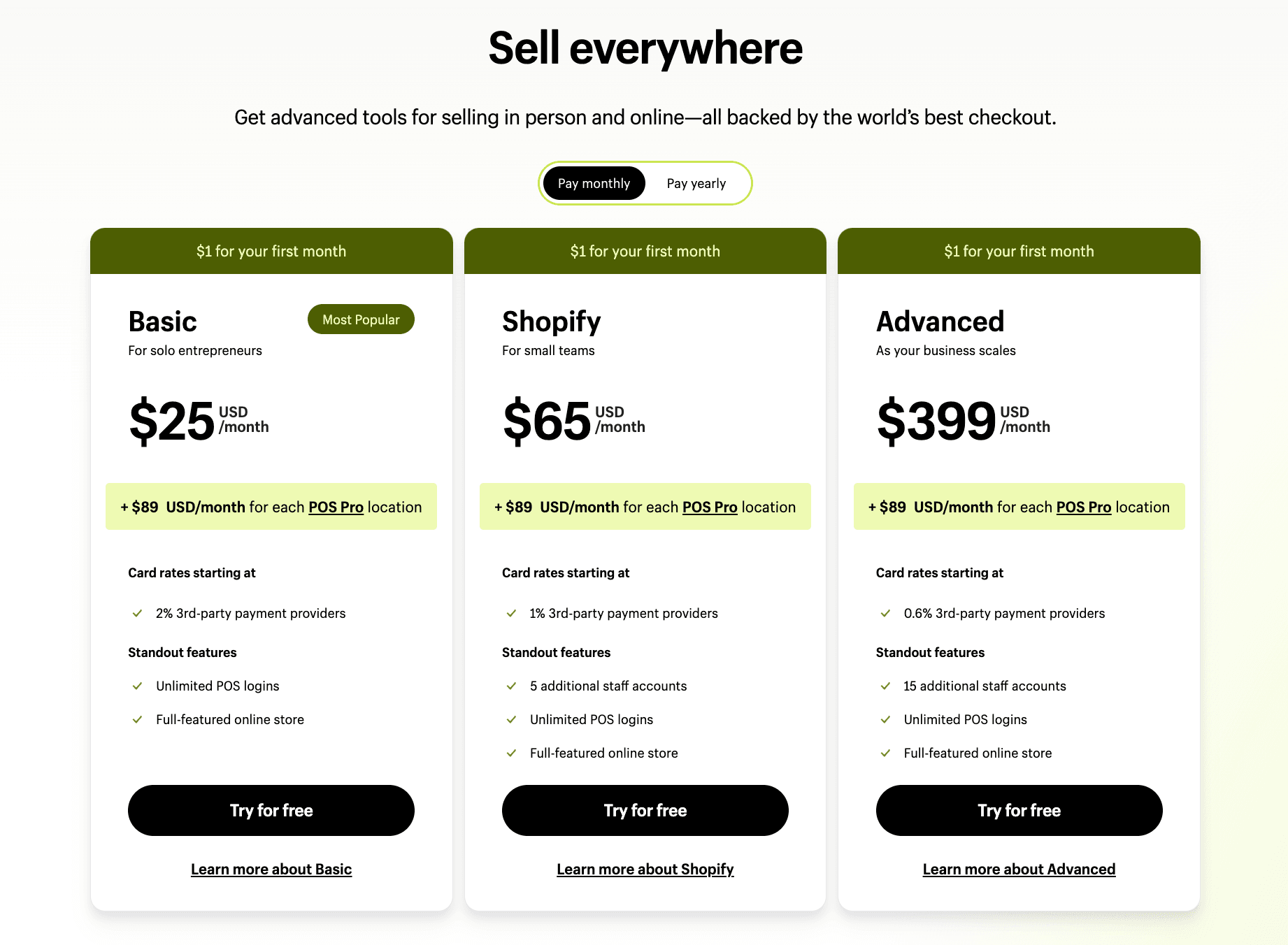- Shopify Plan: $65 USD/month + $89 USD/month per POS Pro location.