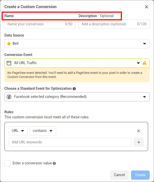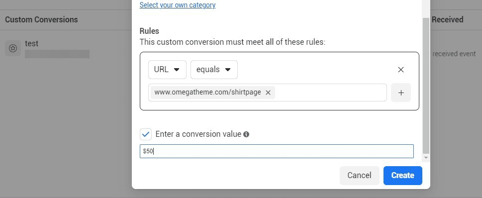 You can add a URL or part of the URL representing your custom conversion (ex: URL contains /thankyou.php for a thank-you page after purchase). This would be equivalent to using the Make purchase standard event. If you’re using URL Equals, make sure you include the domain (for example www.omegatheme.com/shirtpage) too. Don’t need to include “HTTP” or “https”. Add a conversion value if applicable (ex: If you’re selling shirts worth $50, put $50 into the Conversion value field). Including a conversion value allows you to view your return on ad spend in your report.
