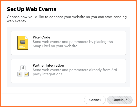It allows you to select the method to connect Snap pixel with your website through pixel code (manual setup) and Partner Integration.