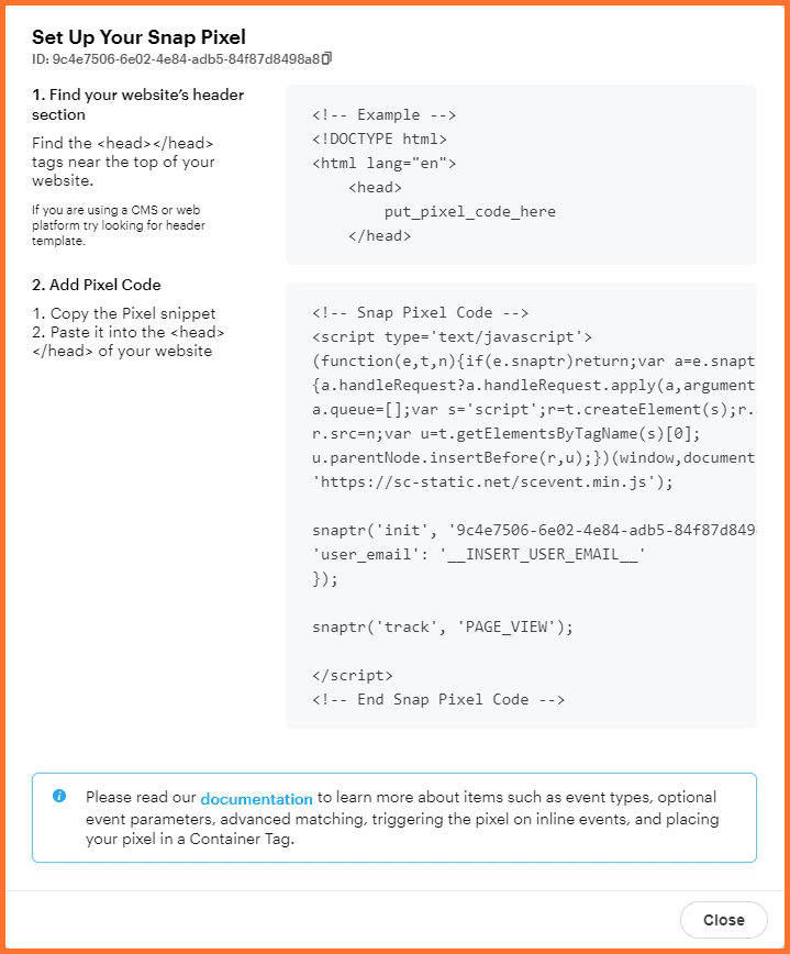 Then select the Setup Snap Pixel option, the pop-up will appear.