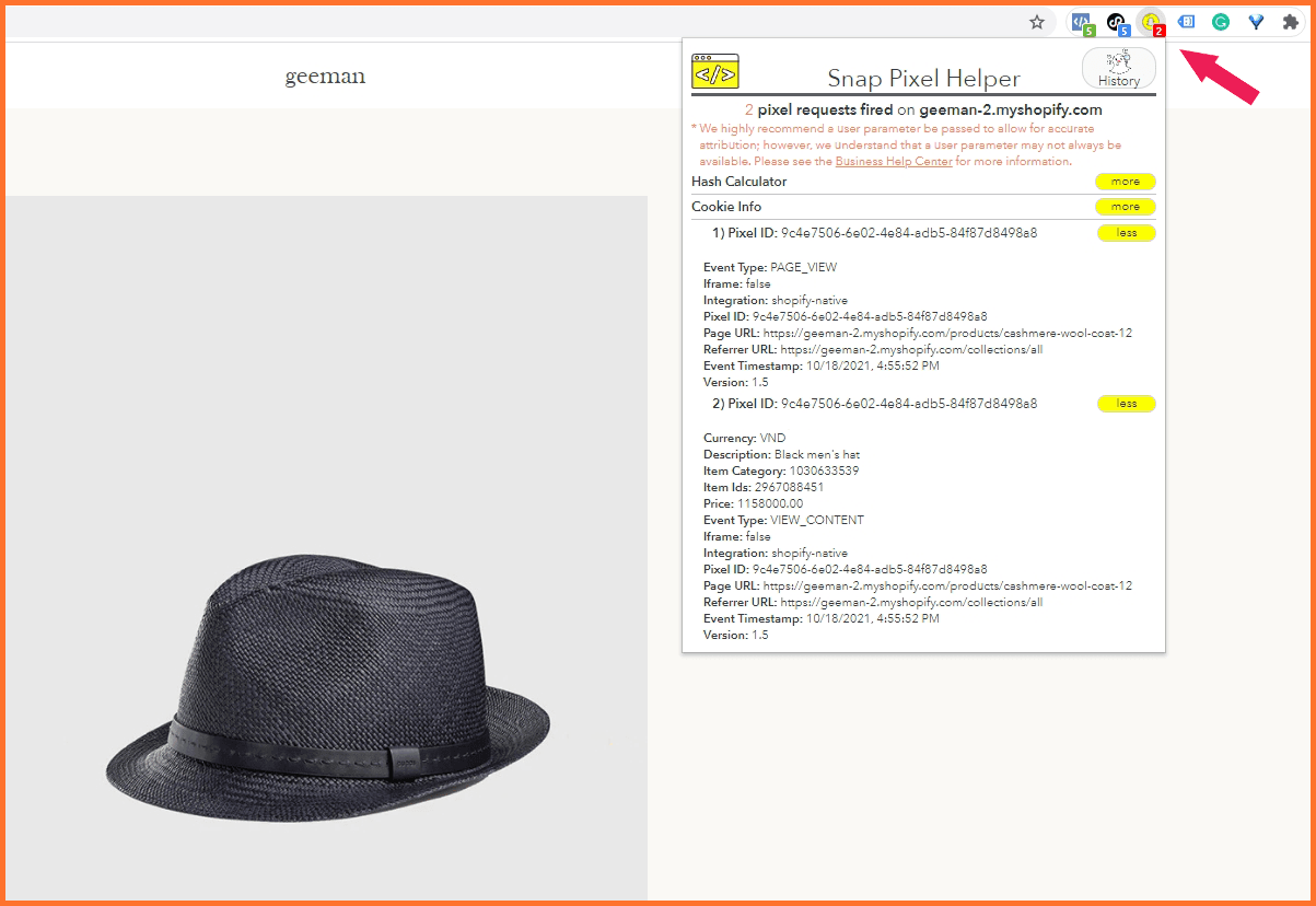 The Snap Pixel Helper displays the two requests from the pixel fired on the test store, you can check the pixel ID and the item IDs as well.