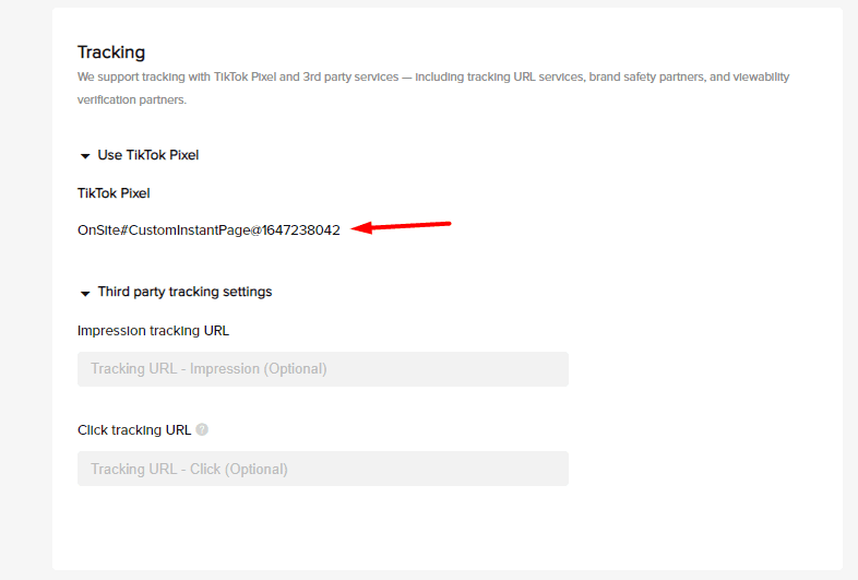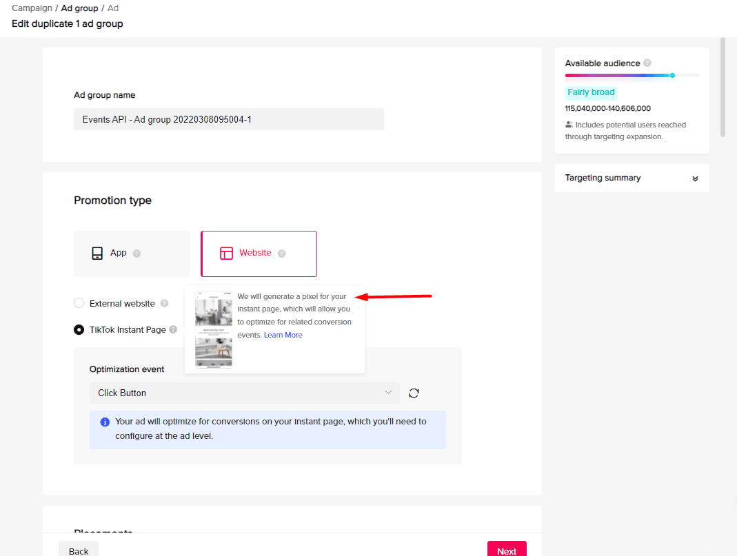 Indeed you can. In the Ad Group Level, choose TikTok Instant Page instead of the external website (your store’s). With this selected, TikTok will generate a pixel to record the button click event on the instant page.