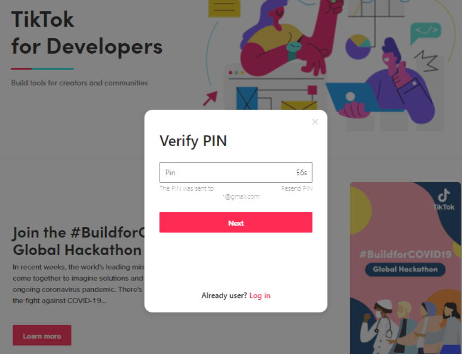 Check your inbox for the TikTok platform’s automated message. Press Next after entering the code to verify your developer account. Remember that you only have one minute to complete this task.