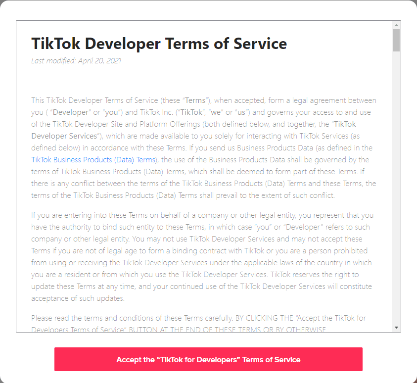 The next step is to read and accept the TikTok Developer Terms and Conditions agreement that appears in the next window.