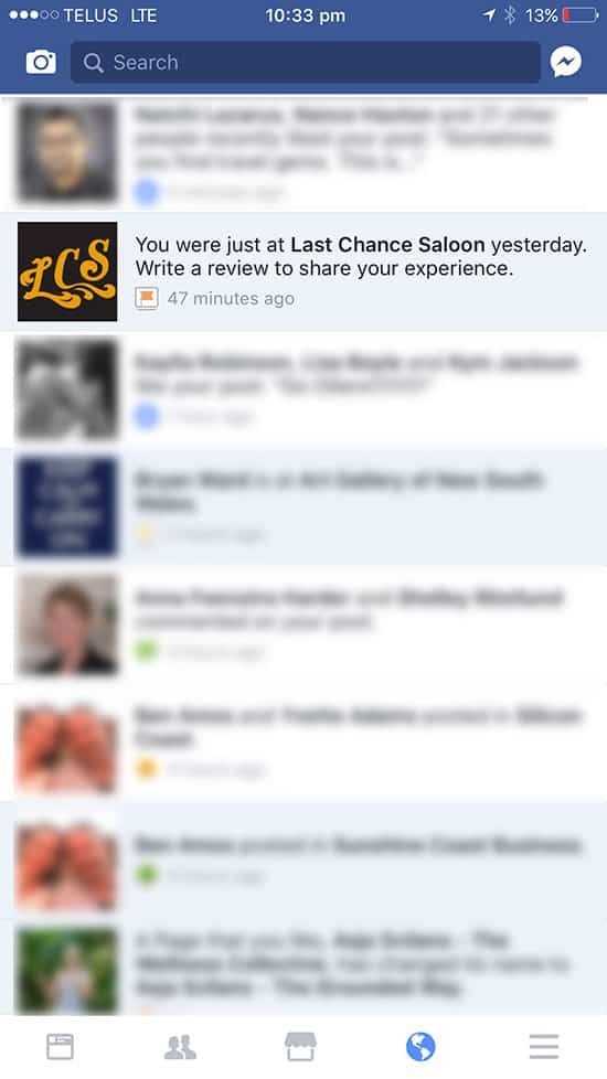 Location check-in is probably one of the most frequently seen aspects of Facebook. You check-in at a location using geo-tagging and Facebook shares that location with your post. For example, I checked-in Last Chance Saloon, and the next day Facebook sent me this notification. Facebook asked me to review the business based on my check-in and probably the business owner didn’t need to do anything. And I did review though.