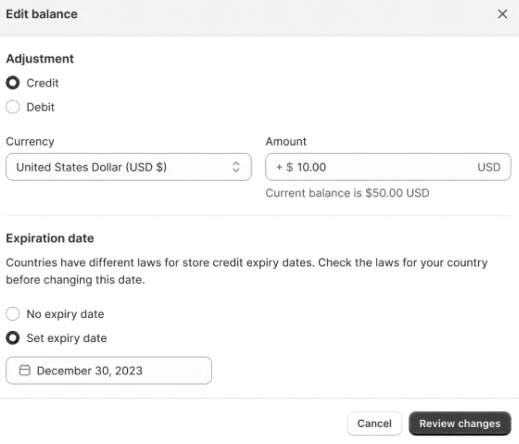 - Click on Review changes to see a summary of the store credit details you have entered.