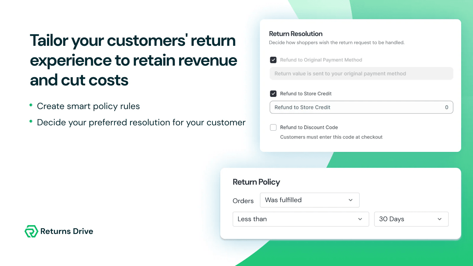 Several apps can provide direct store credit functionality, such as Returns Drive. These apps allow you to issue store credits directly to customer accounts without relying on discount codes or gift cards.