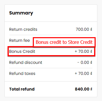 First, let’s explore how Refund to Store Credit works. In the portal, you need to enable the option and set the amount. This allows customers to receive a bonus based on the subtotal. In the app, the bonus credit will be displayed in the management details.