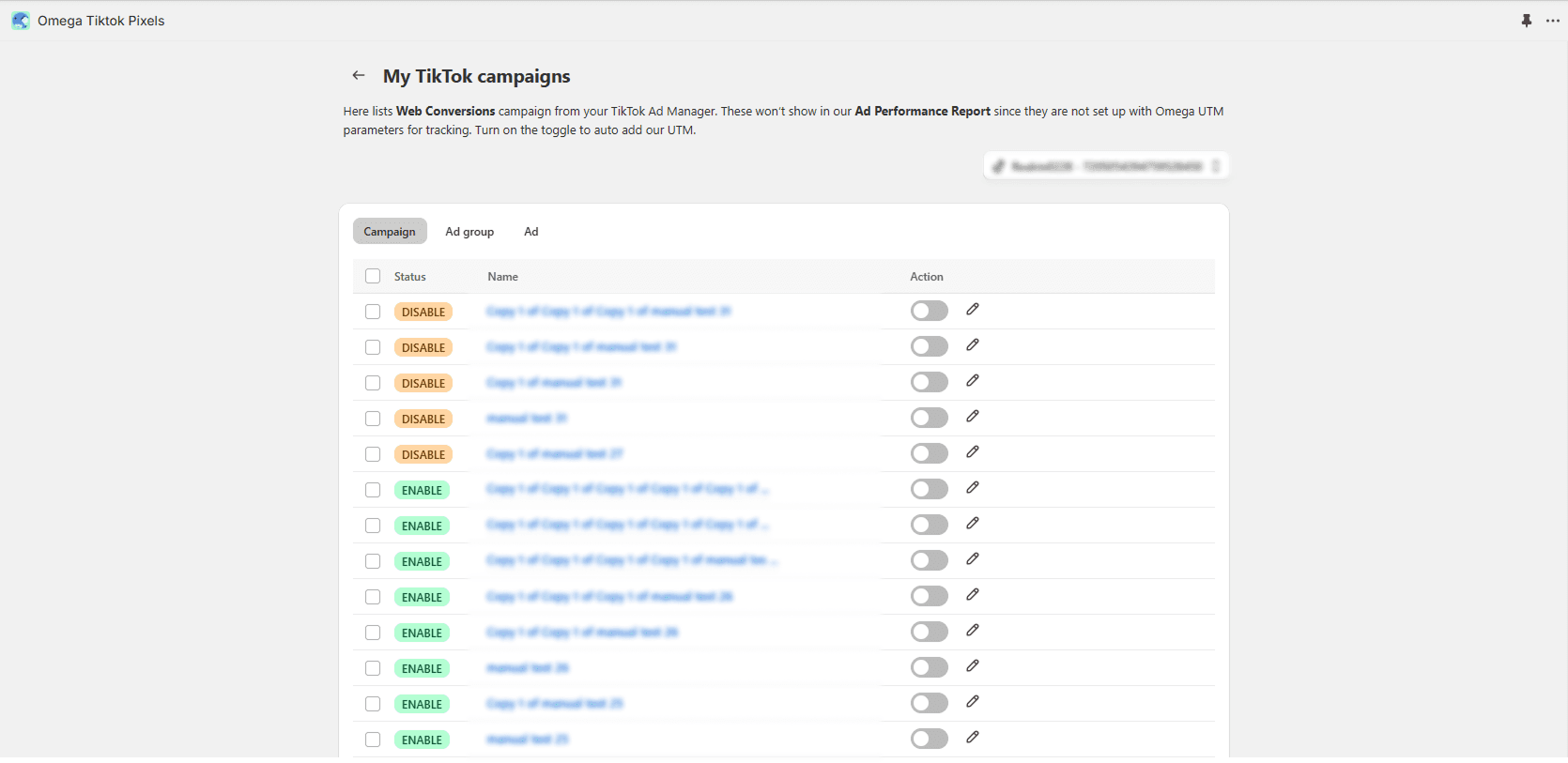 Merchants who opt for manual campaigns still benefit from Omega’s automation. When setting up your ad, simply turn on the UTM tracking toggle in the app, once enabled, UTM parameters are automatically embedded into your TikTok ad URLs.