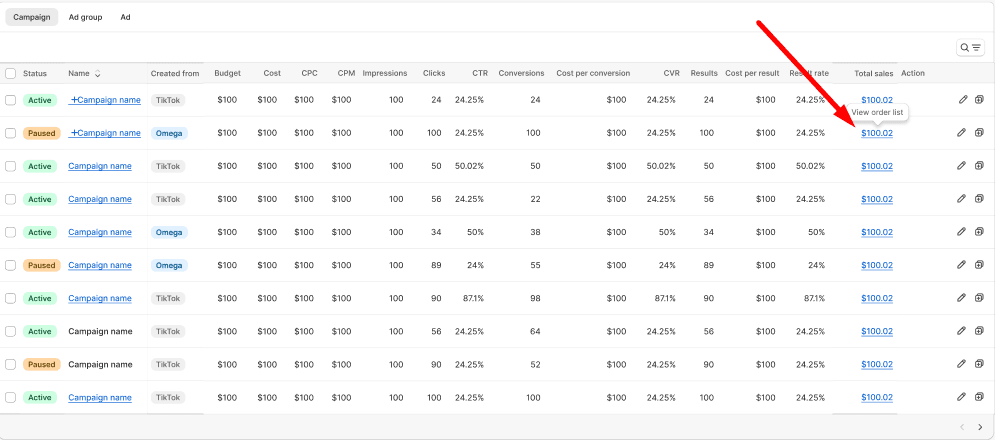 Omega goes beyond pixel events with a built-in Order List feature directly attached to your Total Sales metric. From there, you can explore a full list of orders generated via TikTok ads.
